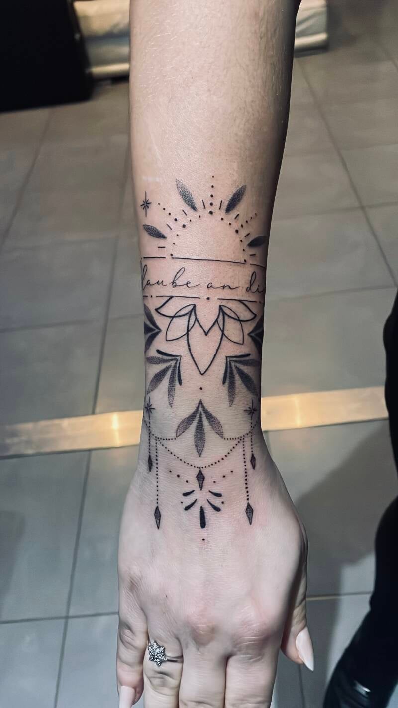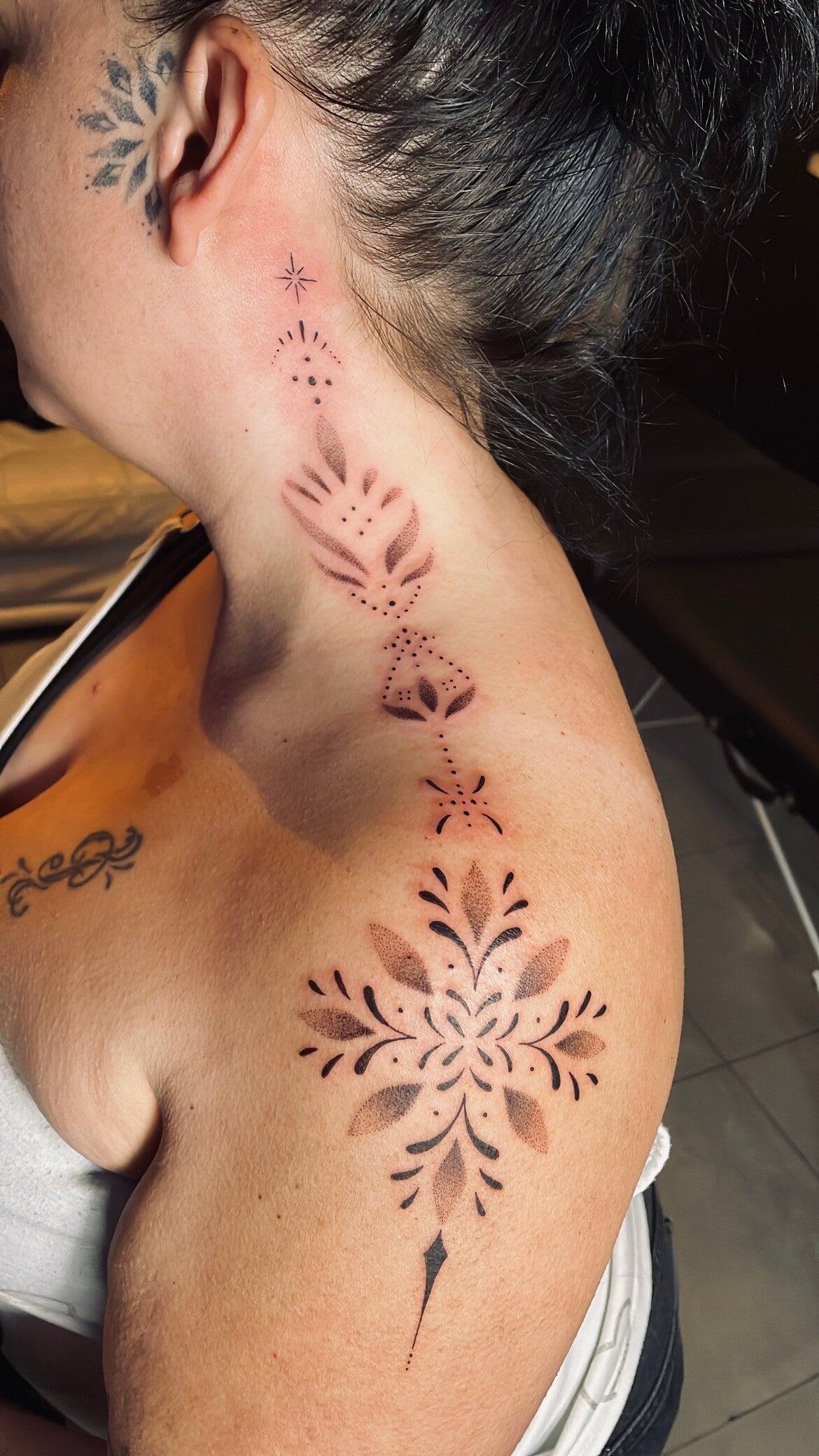 J'aime réaliser les mandalas en dotwork et le fine line, des styles qui demandent précision et patience. Chaque point, chaque ligne est posée avec intention pour créer des motifs détaillés et harmonieux. Mes créations sur mesure s'adaptent parfaitement à votre peau et racontent votre histoire avec finesse et délicatesse.